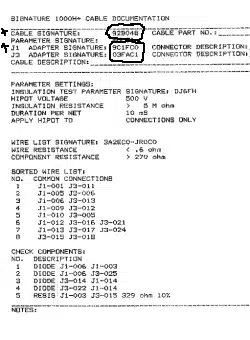 - Always use a “likely correct” cable to learn from. This presents negligible risk (no risk for single errors) of cable assemblies having the same “Cable Signature” even though the cables are different. It is always a good practice to save the learned “good” wire list to memory and to not learn an assembly each time you wish to test a run of cables. Another safe option is to print out the learned wire list and compare, line by line, the learned wire list to the saved wire list to confirm that each list is the same. (You may still compare signatures if you choose to manually inspect wire lists because our experience has been that people do miss differences much more often than once in 16,777,216 times).